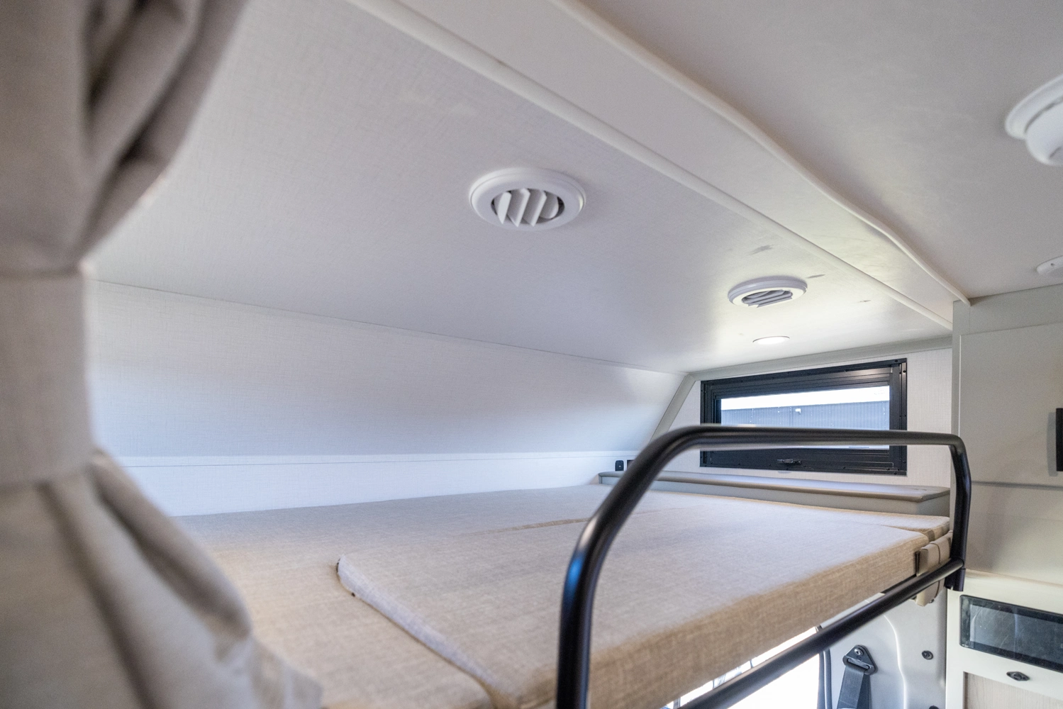 • Extended Fiberglass Front Cap with Cab-Over Bunk Mattress (50"x79") and Privacy Curtain