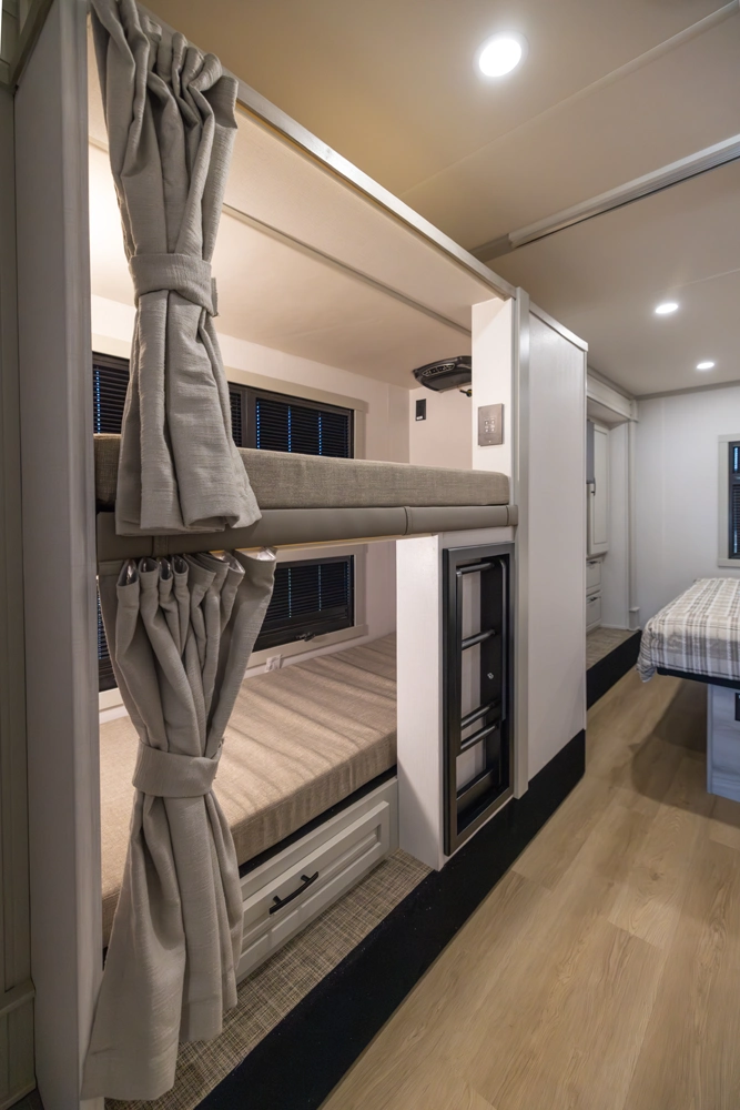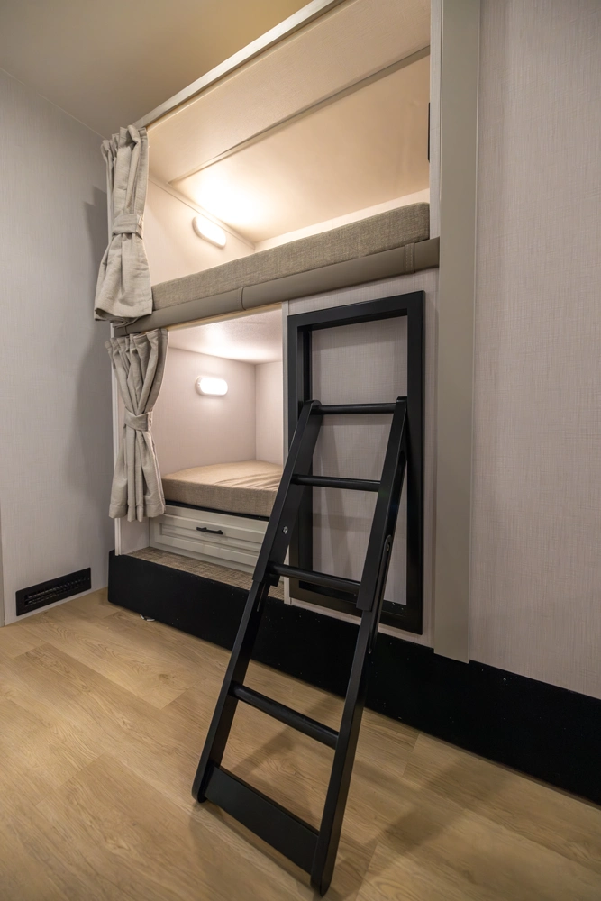 The DX3 37BD floorplan has one entry and two slide outs. Exterior features include: 13'6" awning and outside entertainment. Interiors features include: bunk beds, rear bedroom and bunk over cab.