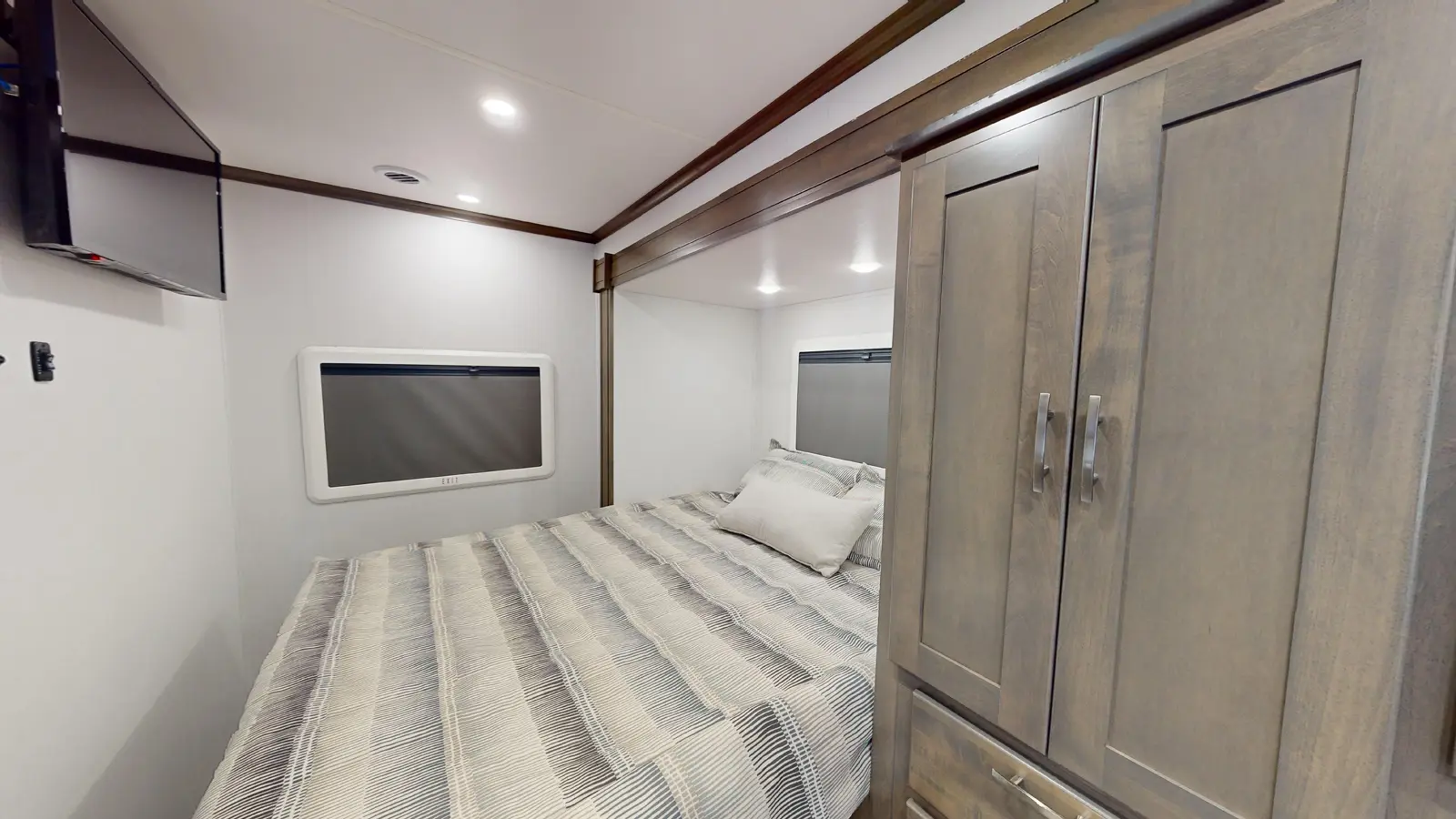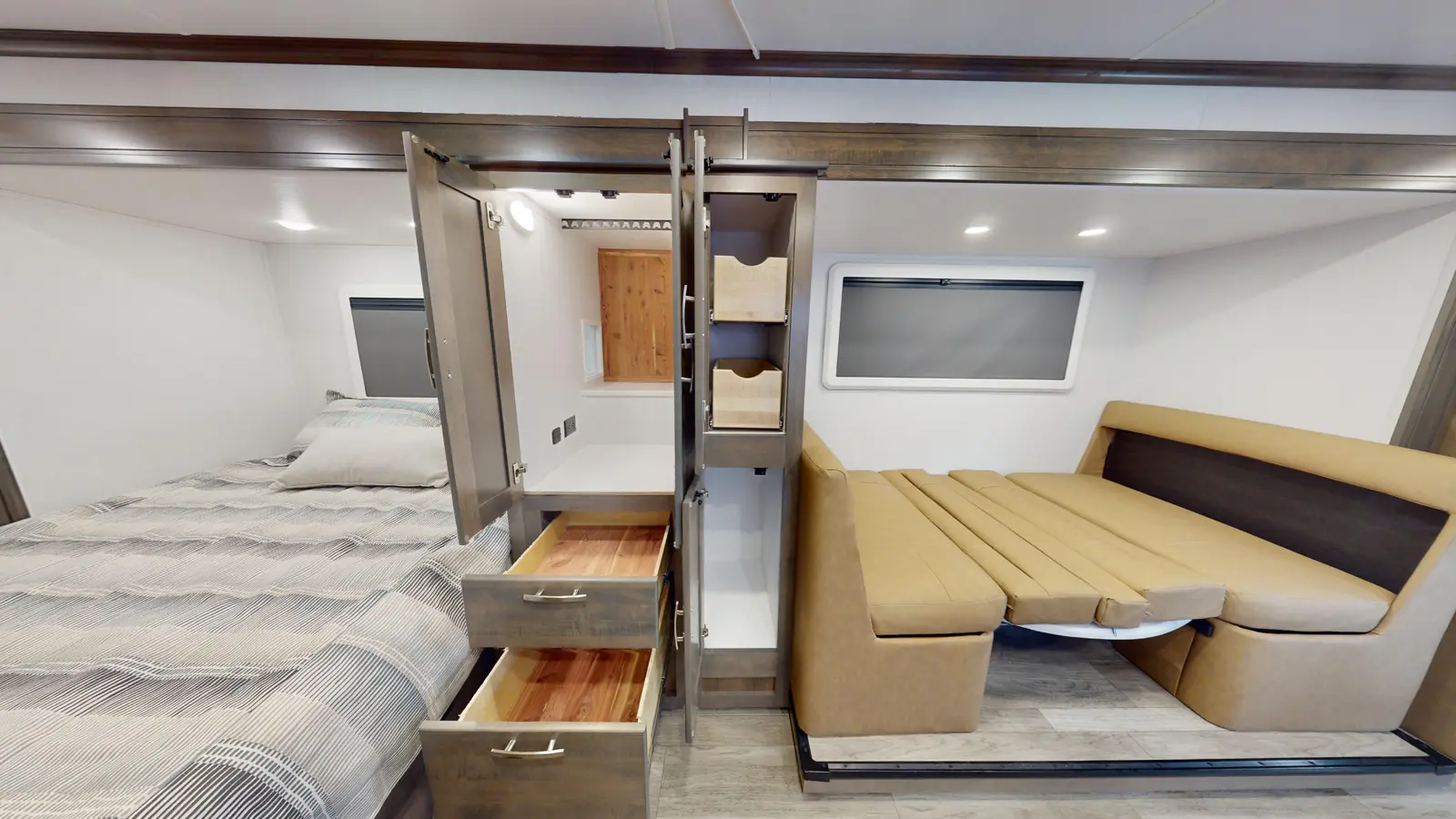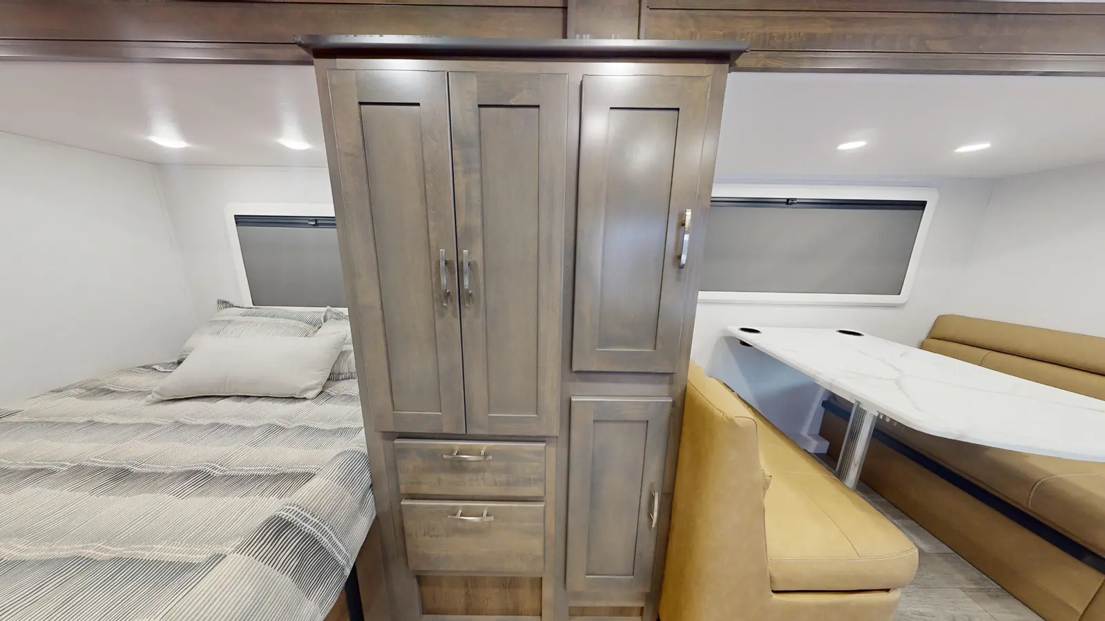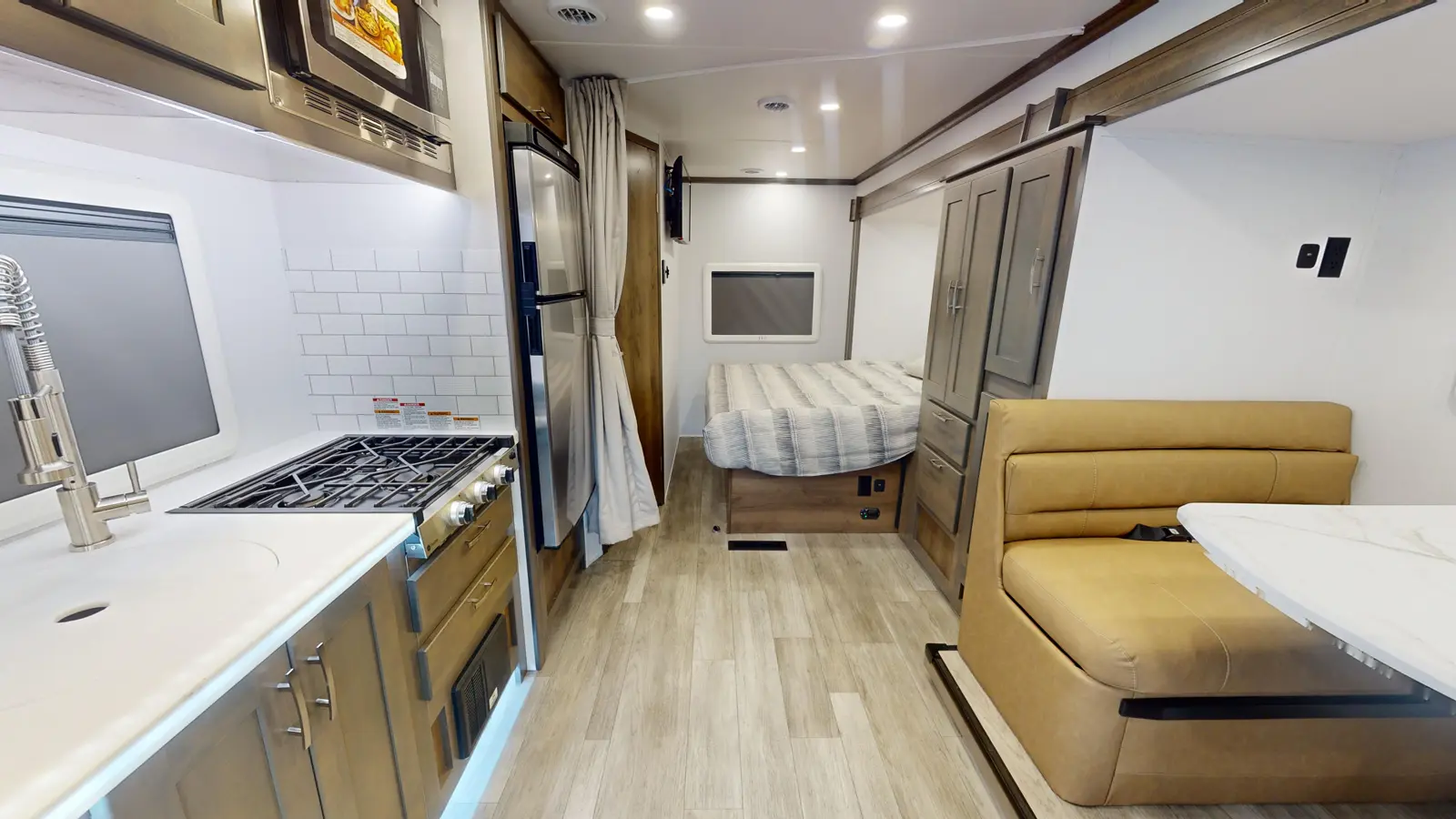 This 24'7" full wall slide offers a large, open-concept living area. This floorplan features a queen size bed, large wardrobe and pantry, standard booth dinette, a fully equipped kitchen, and a full bath.